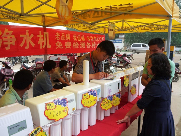 •     5月26日,榮事達在河南信陽甘岸鎮開展“榮事達凈水機 入小區 下基層 送健康”活動,推廣健康飲水。榮事達凈水產品深受當地消費者喜愛,活動當天售出30多臺機器。