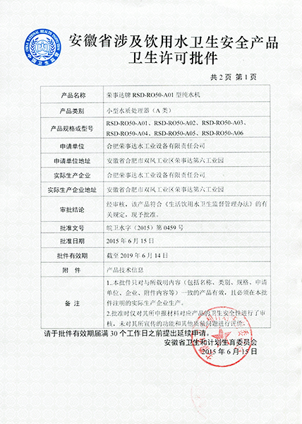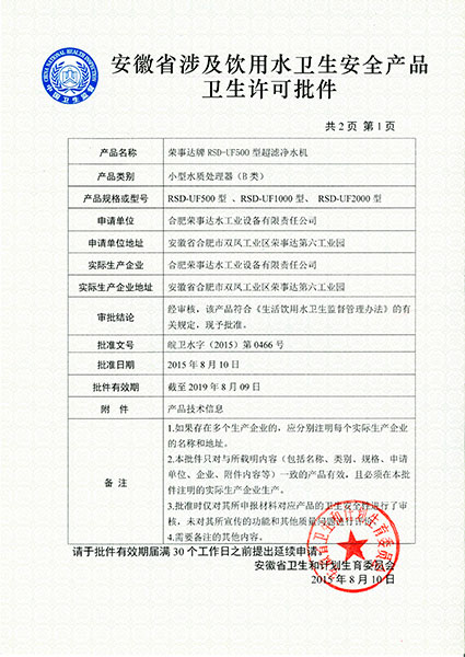 RSD-UF500超濾凈水機衛(wèi)生許可...