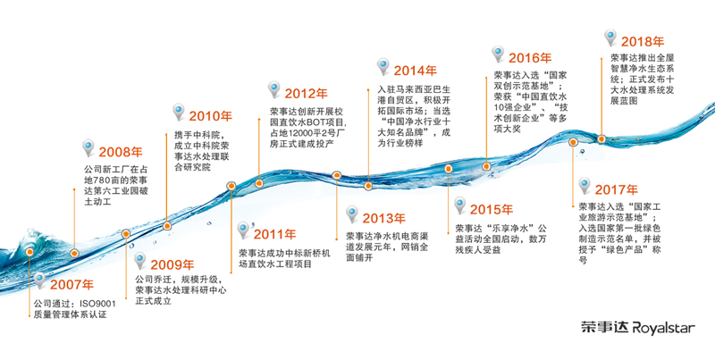 20185月,榮事達正式發布十大水處理系統發展藍圖,全面布局全屋智慧凈水、校園直飲水、城市公共飲水、社區智慧飲水、農村安全飲水、工業污水處理、生活污水處理、景觀水處理、醫療用水處理、海水淡化十大領域。