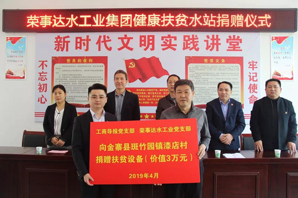 •        4月12日,榮事達水工業集團黨支部攜手工商導報社黨支部全體黨員赴金寨縣漆店村開展扶貧捐助活動。工商導報社社長、黨支部書記儲靈,省工商聯駐漆店村扶貧隊隊長張龍祥,安徽省凈水行業協會秘書長柳敏,榮事達水工業集團黨支部書記劉漢民、榮事達水工業總經理王悅生等領導出席活動。