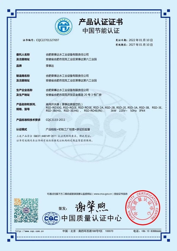 榮事達RSD-RO3E直飲機和榮事達RSD-RO2E幼兒園機均采用節(jié)能熱交換技術(shù),省時省電,實現(xiàn)了節(jié)能環(huán)保理念,獲得了中國節(jié)能認(rèn)證。