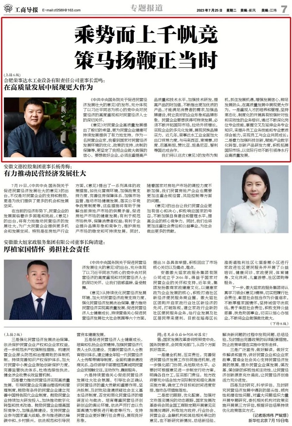 • 媒體聚焦|工商導(dǎo)報(bào)“合肥榮事達(dá)水工業(yè)設(shè)備有限責(zé)任公司董事長(zhǎng)雷鳴:在高質(zhì)量發(fā)展中展現(xiàn)更大作為”