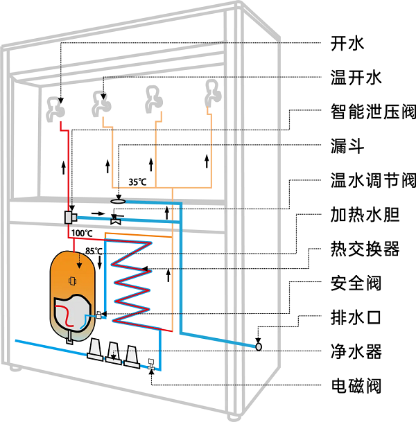 設(shè)備采用節(jié)能熱交換技術(shù),熱損低,更節(jié)能;保溫結(jié)構(gòu)設(shè)計(jì),保溫效果好。多水龍頭布局,有效應(yīng)對(duì)飲水量大與飲水集中的問題,確保供水順暢。特別設(shè)計(jì)的溫開水出水口,貼心呵護(hù)小學(xué)生的飲水需求,安全又溫馨。